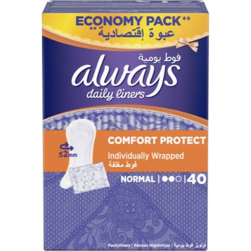 No matter where life takes you, Always Daily Liners Comfort Protect Normal will keep you fresh and protected. Individually wrapped for additional hygiene so you can carry them with you on the go and still feel fresh throughout the day. • Panty Liners individually wrapped for convenient on-the-go freshness• Neutralizes odours to give you freshness andContinue reading “Always فوط صحية يومية بالأجنحة – 40 فوطة”